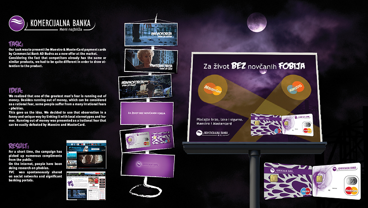 „Ljudi su često suočeni sa najrazličitijim strahovima, bili oni racionalni ili iracionalni. Odmah smo znali da moramo da uradimo nešto nesvakidašnje kako bi privukli pažnju ciljne javnosti“, kaže Sandra Vujović, copywriter u agenciji McCann Podgorica i dodaje: „Iracionalni strahovi, odnosno fobije, su nam, svojom raznolikošću i bizarnošću, odmah privukle pažnju i dovele nas do ideje: sa platnim karticama možemo pobijediti sve novčane fobije. Odlučili smo da sva ova zapažanja iskoristimo u kampanji, ali na jedinstven način, vezujući ih za lokalne stereotipe i humor“.
